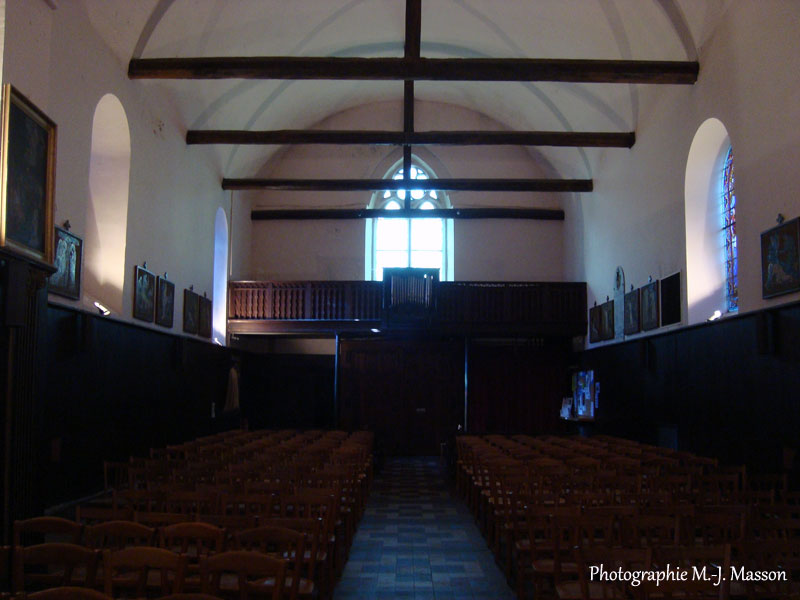 Photographies M.-J. Masson : (1) entrée de l’église prise depuis le maître autel, (2) le maître autel et le magnifique retable avec Saint Éloi et Saint Sébastien, les deux « patrons » de l’église du Perray.