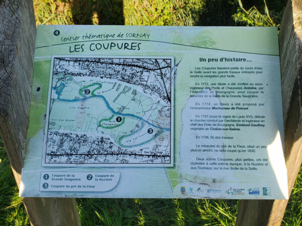 Un grand viron vers le sud-est, commençant par une halte en Haute-Saône, au bord de la Seille. Sornay fut un haut-lieu du maraîchage avant que cette activité ne cède devant les importations. Dommage. Balade le long de la jolie Seille et découverte des travaux effectués pour en simplifier le cours (voir photo « les coupures »). Repas et nuit extras à L’Ecluse, ancienne maison éclusière comme son nom…