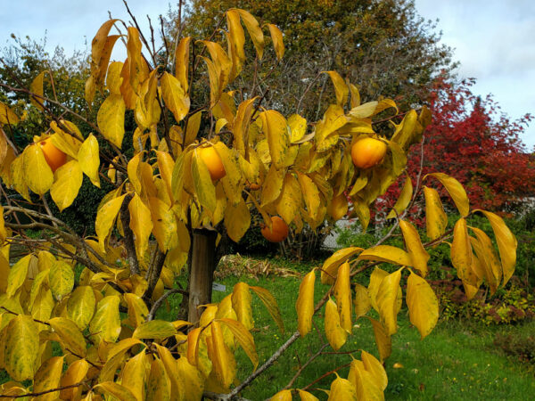 Je ne me lasse pas de voir l’évolution de notre plaqueminier adolescent. Grand vent aujourd’hui, sur la prochaine photo il n’y aura plus de feuilles et les fruits peu à peu rougiront.